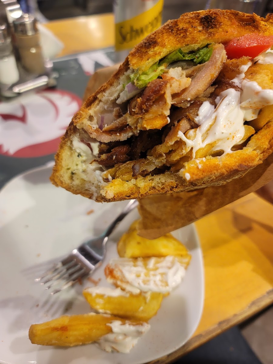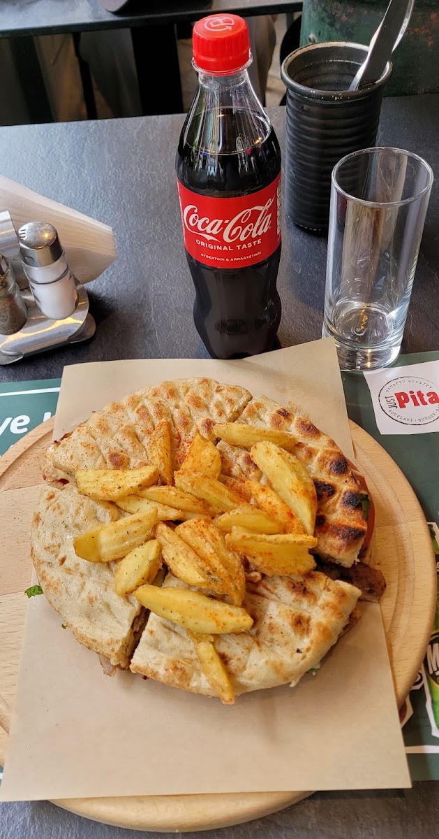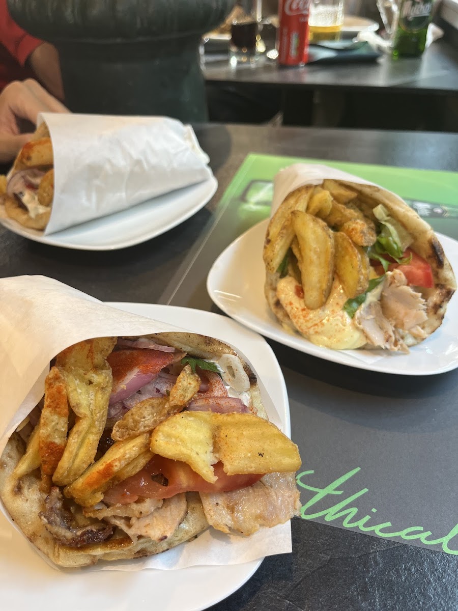 Just pita offers a wide selection of gyro dishes. Good service and prices. Gyros wraps cost between €5 and €8. I recommend the Thrakopsomo gyros wrap. The bread is delicious, with a soft and crispy texture. I still don't understand why Greeks put French fries in a wrap. Maybe that's why they're not so fit! Anyway, you can order it without fries. One of the best gyros in Athens.